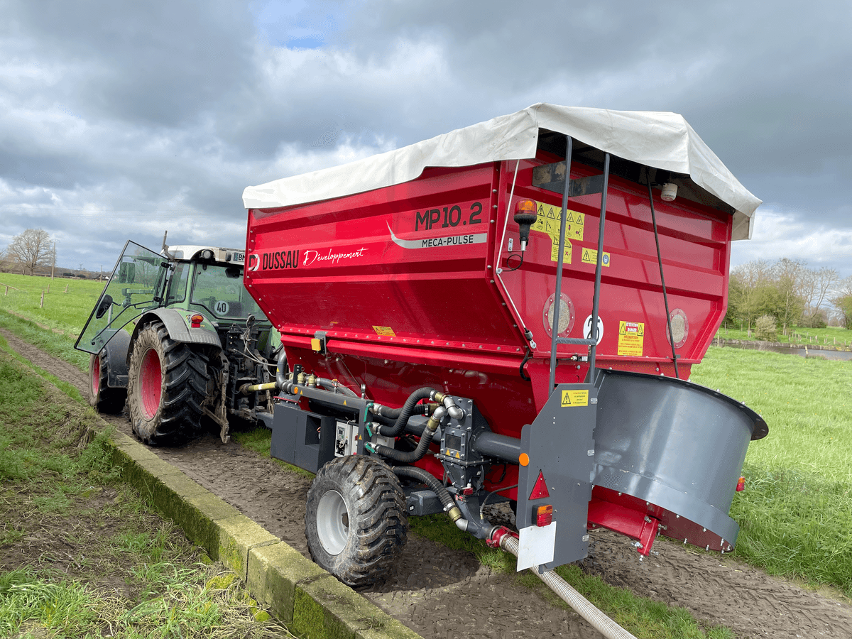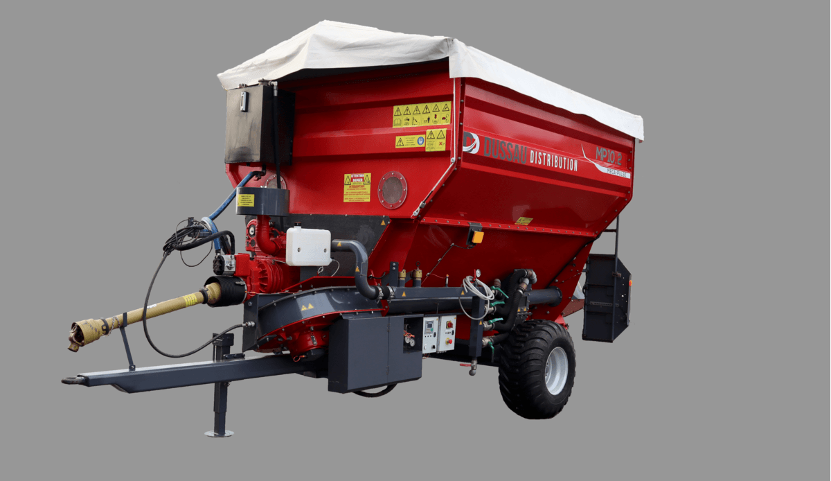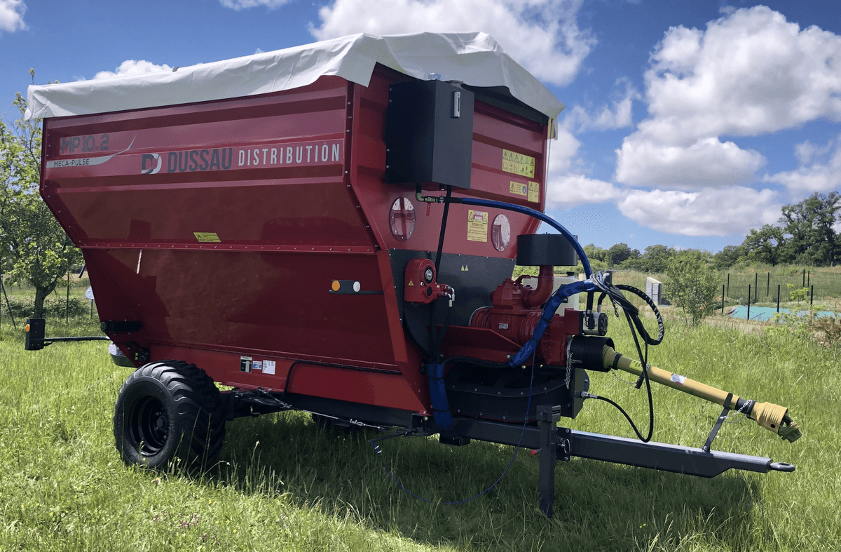 Version tractée pour multi-produits, actionnée par une PDF 540 tr/min, centrale hydraulique et bâche rétractable de série, connexion simple à l'extérieur des bâtiments. Rayon d'action de 70 à 120m selon les substrats, respect des conditions de biosécurité, pour tous types d’élevages. Photo Meca-pulse non contractuelle.