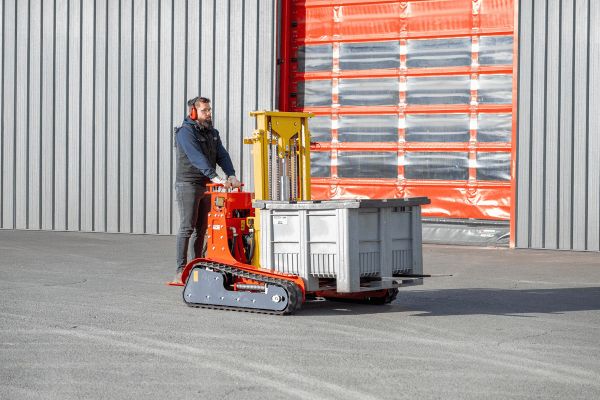 Le transpalette sur chenilles TRACKPALL motorisé tout-terrain parfait pour une utilisation sur différents types de terrains ou chemins qu’ils soient boueux, difficiles et escarpés. Avec déplacement de charges jusqu’à 1200 kg et la possibilité de gerber jusqu’à 1,80 m avec inclinaison des fourches de 14° (-6°/+8°). Avec un centre de gravité bas pour une grande stabilité. Une machine compact pour pouvoir la charger sur une remorque ou un camion plateau. Capacité de franchissement 20°. Moteur thermique essence VANGUARD 17,15 kW / 23 ch avec uns vitesse de déplacement de 4,1 Km/j .