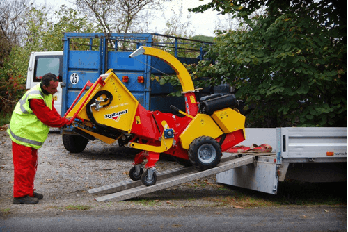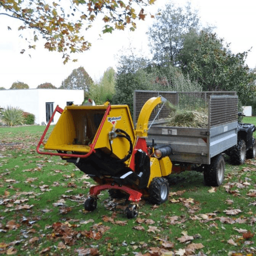 Broyeur à déplacement autotracté grâce aux 2 roues commandées hydrauliquement pour un diamètre de branche de 110 mm. Machine sécurisée : Barre de sécurité 4 positions et arrêt d'urgence avec bouton de réinitialisation.