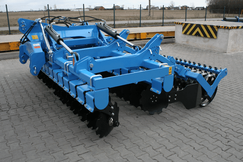 La gamme de déchaumeurs se compose de modèles portés ou trainés sur amortisseurs en caoutchouc. 1) Le modèle porté à disques, avec terrage mécanique ou hydraulique : Attelage 3 points cat. II et III deux rangées de disques dentés de 560 mm de diamètre. deux disques de bordure. Protection des disques, amortisseurs en caoutchouc. Rouleau barre diamètre 500 mm et 540 mm sur terrage hydraulique. 1 rangée d’herse peigne sur la version terrage hydraulique (en option sur terrage mécanique). Repliage hydraulique à partir de 4 m. Grand choix de rouleaux en option. Largeur de travail de 3 m à 6 m, poids de 1 328 à 4 416 kg. Puissance requise de 80 à 210 cv. MODELES : 8521N-8521Na-8522N-8522Na (terrage mécanique) 8436-8436a (terrage hydraulique) 8523N-8523Na-8524N-8524Na-8525N-8525Na-8526N-8526Na (version reliage hydraulique). 2) Le modèle trainé à disques, terrage hydraulique : Barre d’attelage cat. II et III. deux rangées de disques dentés de 560 mm de diamètre. Protection des disques amortisseurs en caoutchouc. deux disques de bordure. une rangée d’herse peigne devant le rouleau. Rouleau barre de 540 mm de diamètre. Déflecteurs latéraux réglables en hauteur. Chariot autoporteur intégré avec la machine Profondeur de travail à 15 cm. Repliage hydraulique pour le transport. Grand choix de rouleaux en option. Largeur de travail de 4 à 6 m, poids de 3 960 à 4 450 kg. Puissance requise de 140 à 210 cv. MODELES : 8437 - 8438 - 8439