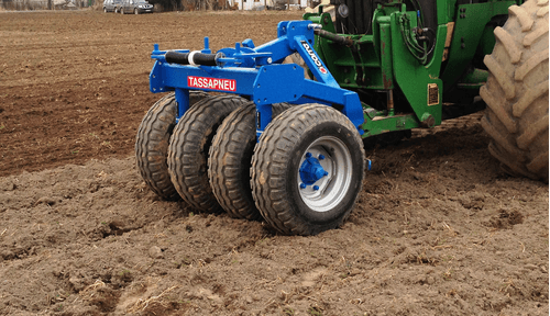 Installés à l'avant du tracteur, les rouleaux auto directionnels TASSAPIRE, TASSADISQUE et TASSAPNEU réalisent un tassement uniforme sur toute la largeur de travail.