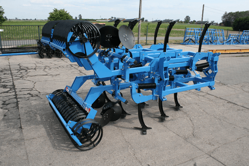 1 rangée de disques dentés de 460 mm de diamètre sur lame de ressort avec réglage mécanique de la profondeur de travail.