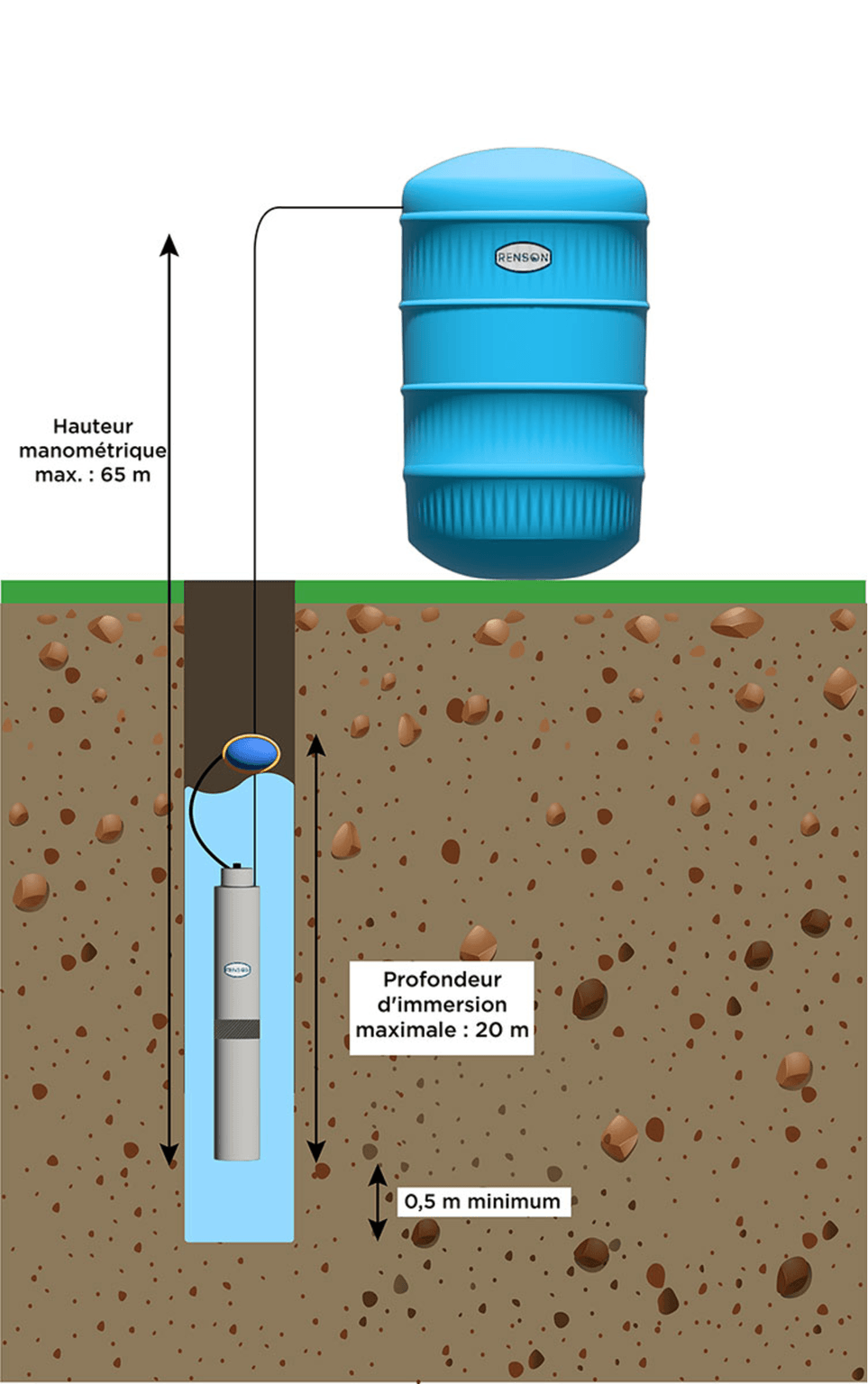 Equipé d'un flotteur, d'un condensateur interne, de 15 m de câble électrique avec prise.