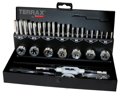 - 7 jeux de 3 tarauds DIN 352 HSS rectifié. Pas métriques M3, M4, M5, M6, M8, M10, M12.