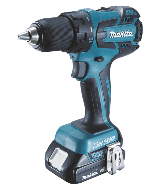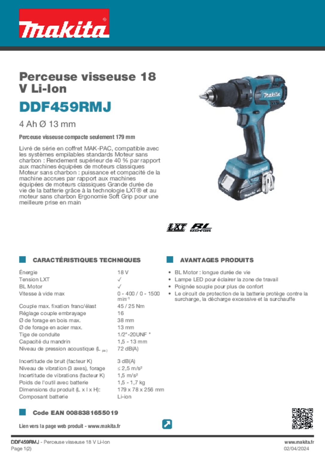 Modèle DDF459RMJ. Nombre de vitesse : 2. Régime à vide : 0 à 400 tr/min, 0 à 1500 tr/min. Couple de serrage maxi : 25 Nm. Couple de serrage maxi (franc) : 45 Nm. Couple réglable sur 16 positions + position perçage. Capacité : acier : 13 mm, bois : 38 mm. Capacité du mandrin : 1,5-13 mm. Poignée à revêtement Soft Grip pour plus de confort. Livrée avec : coffret MAK-PAC. Chargeur, batterie Lithium 18V/4 Ah, crochet ceinture.