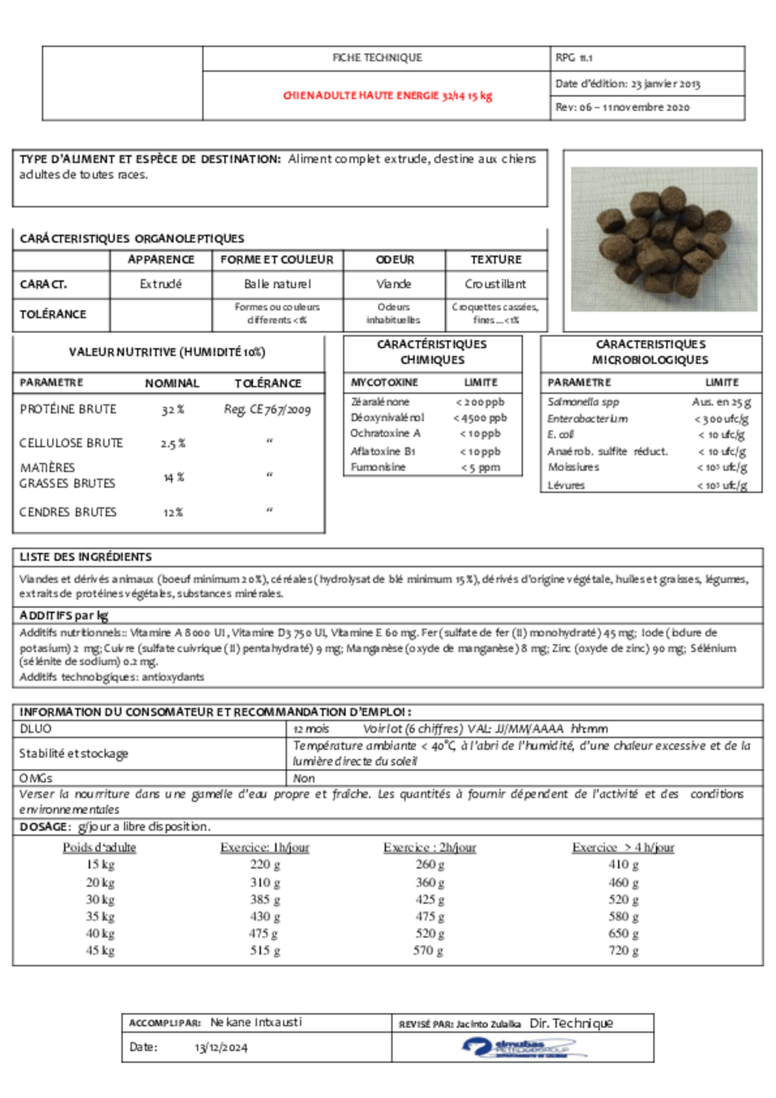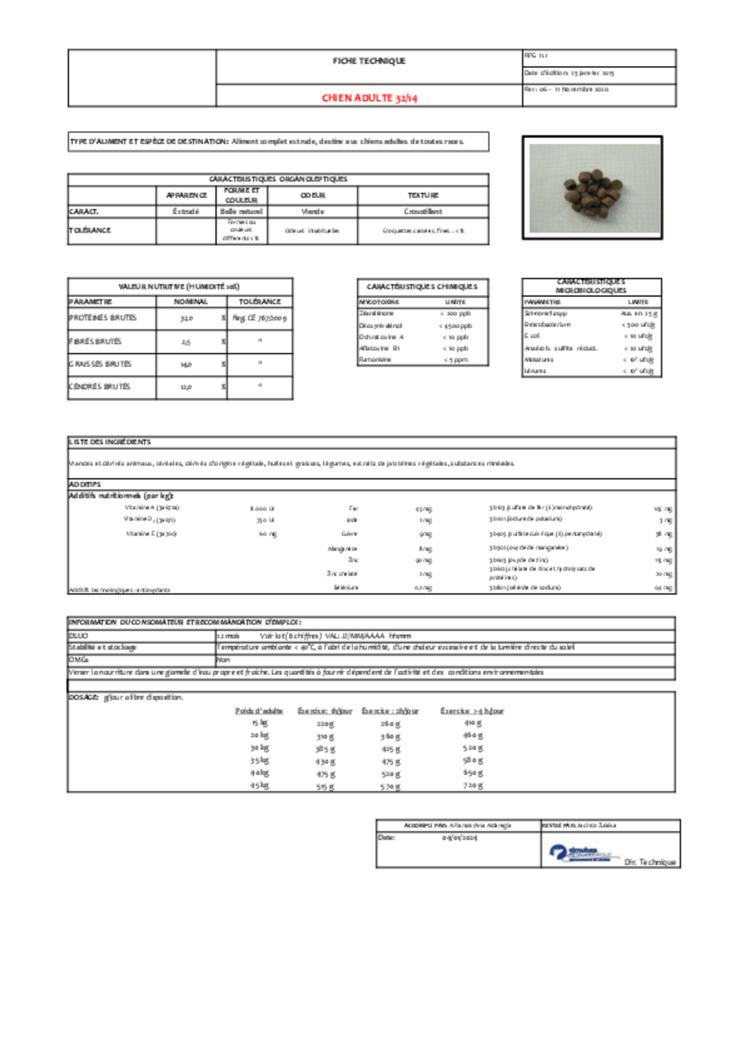 Protéines : 32%, matières grasses : 14%, Taux de phosphore : 1.6 %.