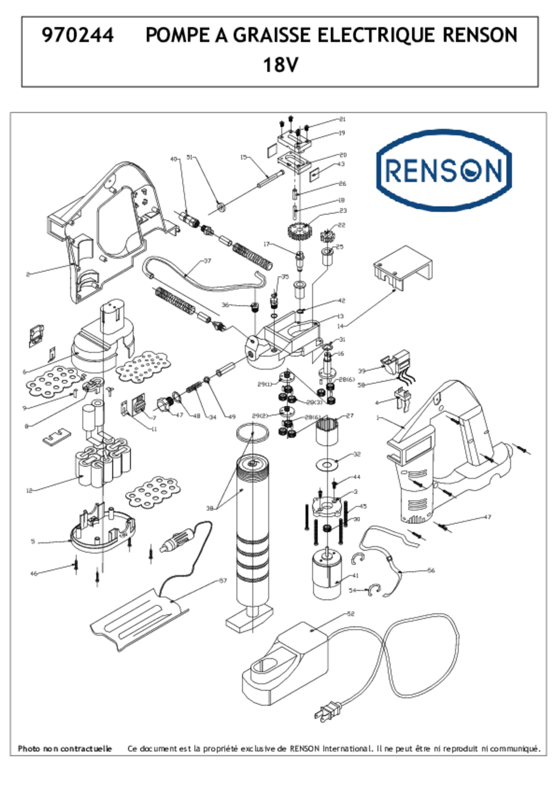 2 batteries 18 V Li-ion rechargeables, 1 chargeur de batteries 230 V, 1 flexible haute pression 1 m, 1 agrafe 4 mors. Pression de travail : 600 Bar. Remplissage : cartouche 400 g, graisse en vrac. Vendu avec coffret.
