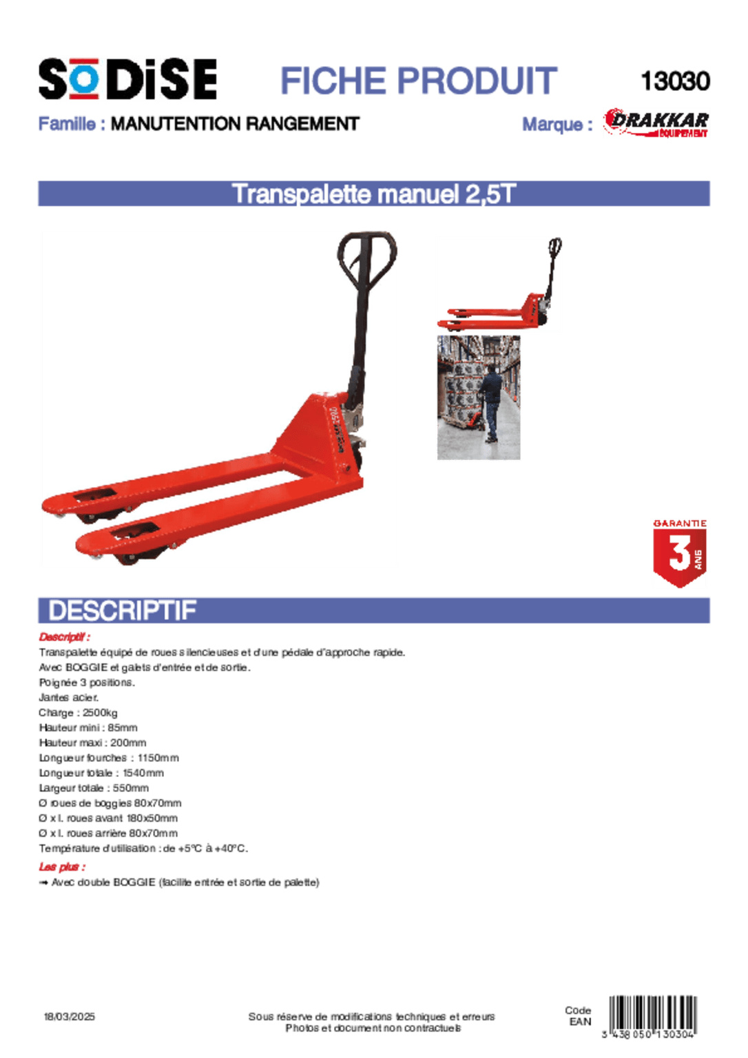 Pelle : 400 x140 mm. 2 roues increvables Ø 260 mm. Charge 250 kg.