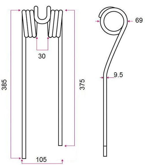 Dent de faneuse Adaptable. Longueur 1 : 385 mm. Longueur 2 : 375 mm. Largeur : 105 mm. Épaisseur : 9,5 mm. Diamètre : 69 mm. Pour Z455, Z555, Z665 H, Z585, Z685, Z765 PRO, Z900 A, Z900 D PRO, Z905 A, Z905 D PRO.