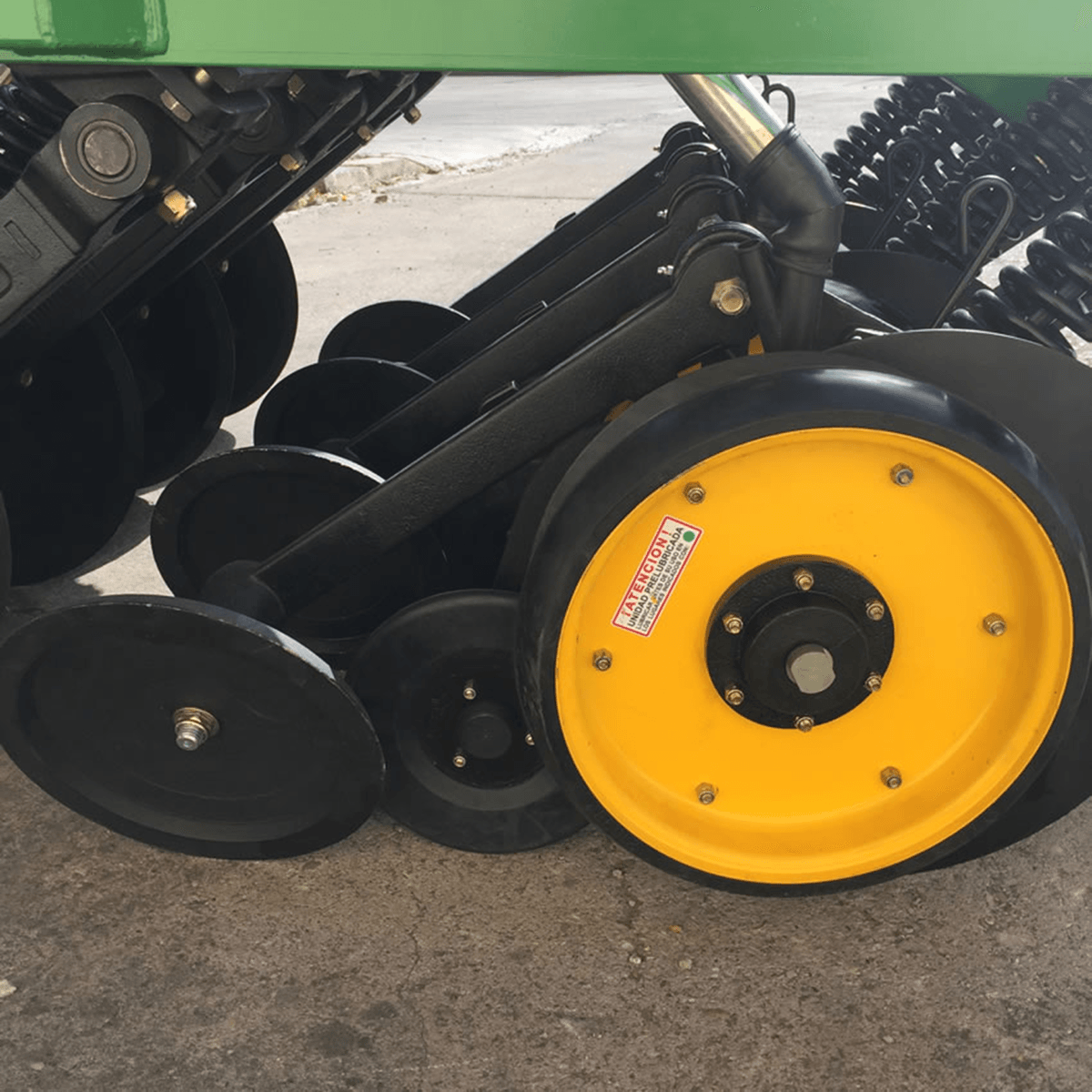 Semoir mécanique direct pour vignobles, système à disques avec roue tasseuse en caoutchouc et roue pour fermeture du sillon, variateur de vitesse, distributeur à ergot double pour les graines fines et les grosses graines, plateau de pesée et passerelle de remplissage. Contrôle de la profondeur indépendant à chaque disque, tubes de descente télescopiques, indicateur du niveau de grain, feux de transport. Capacité de loua trémie de 330 L à 780 L selon les semoirs. Choix d'équipements pour toutes les utilisations.